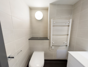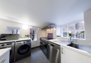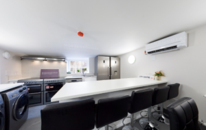 – A bright, open-plan kitchen, dining, and living area, fully furnished with sleek sofas, dining set, and flat-screen TV – perfect for cooking, studying, or socialising as a household
